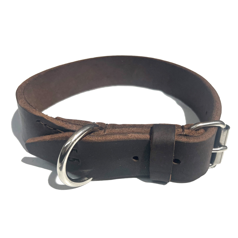 El collar de cuero engrasado Fettleder de Schweikert es fuerte, suave y muy cómodo. La hebilla y la anilla son fuertes y resistentes. Puedes comprarlo en diferentes medidas y anchos.