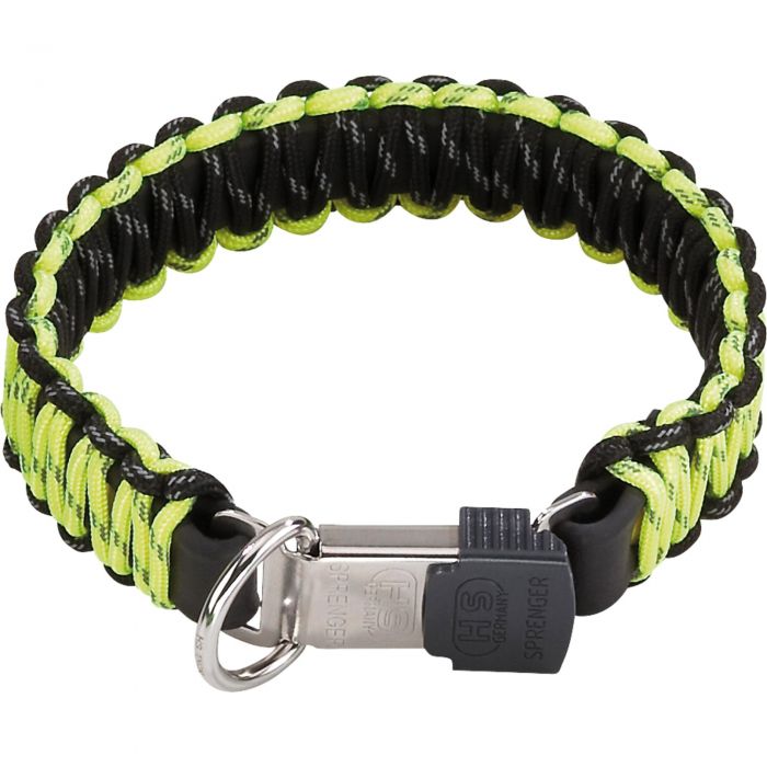 Collar de paracord Hs Sprenger amarillo reflectante: ultra visible y seguro, con secado rápido, resistente al agua y a la suciedad. Interior robusto y duradero remachado con polycord negro, y práctica hebilla SPRENGER ClicLock para un ajuste rápido, cómodo y seguro en cada paseo.